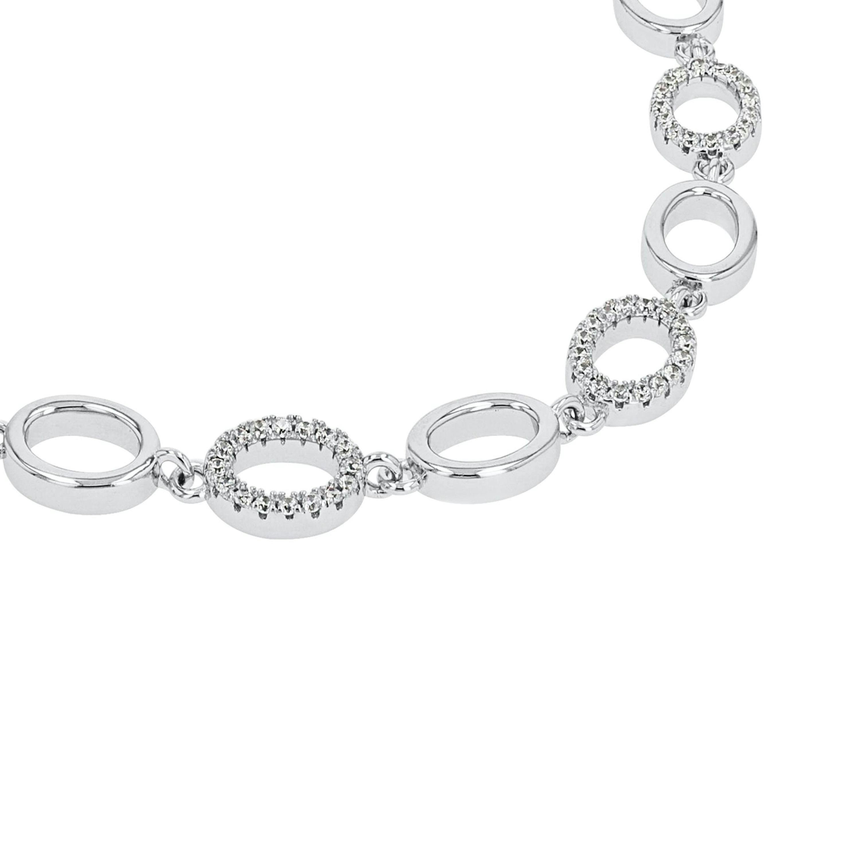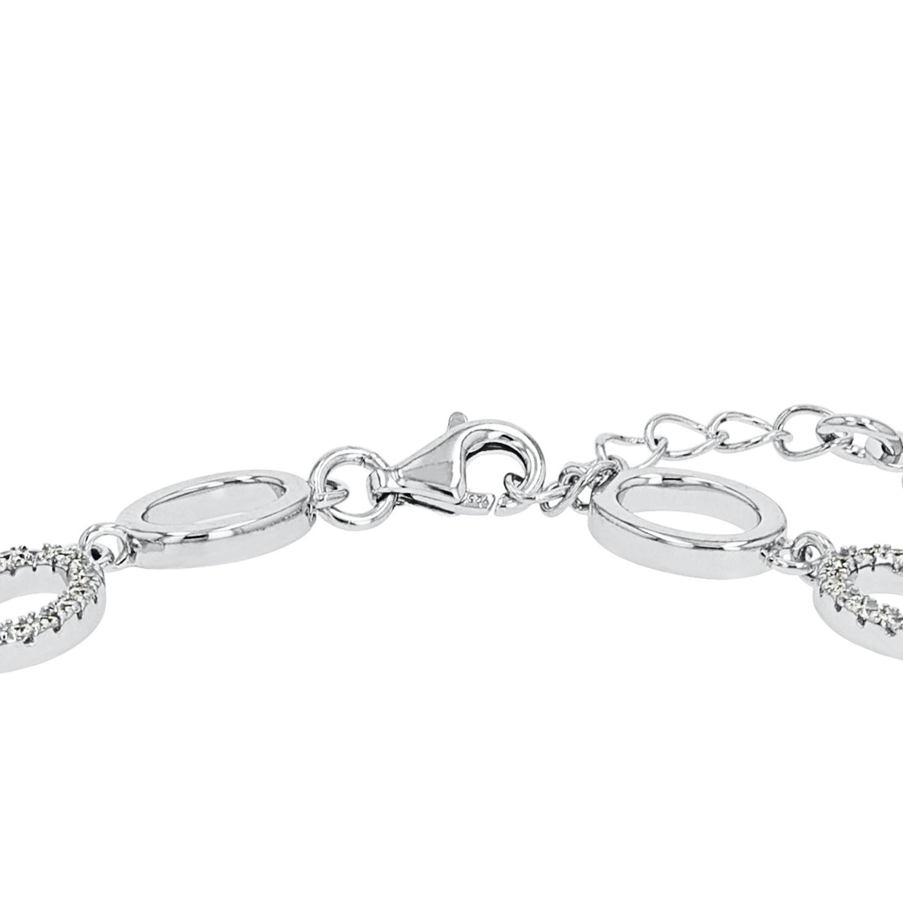 Dieses schöne Damenarmband funkelt dank zahlreicher fein geschliffener Zirkonia (synth.) besonders auffällig. Die 18+2 cm lange Armkette besteht aus aneinander gereihten Elementen, die aus hochwertigem Sterling Silber 925 hergestellt wurden. Schließen lässt sich das Armband sicher über einen Karabinerverschluss.