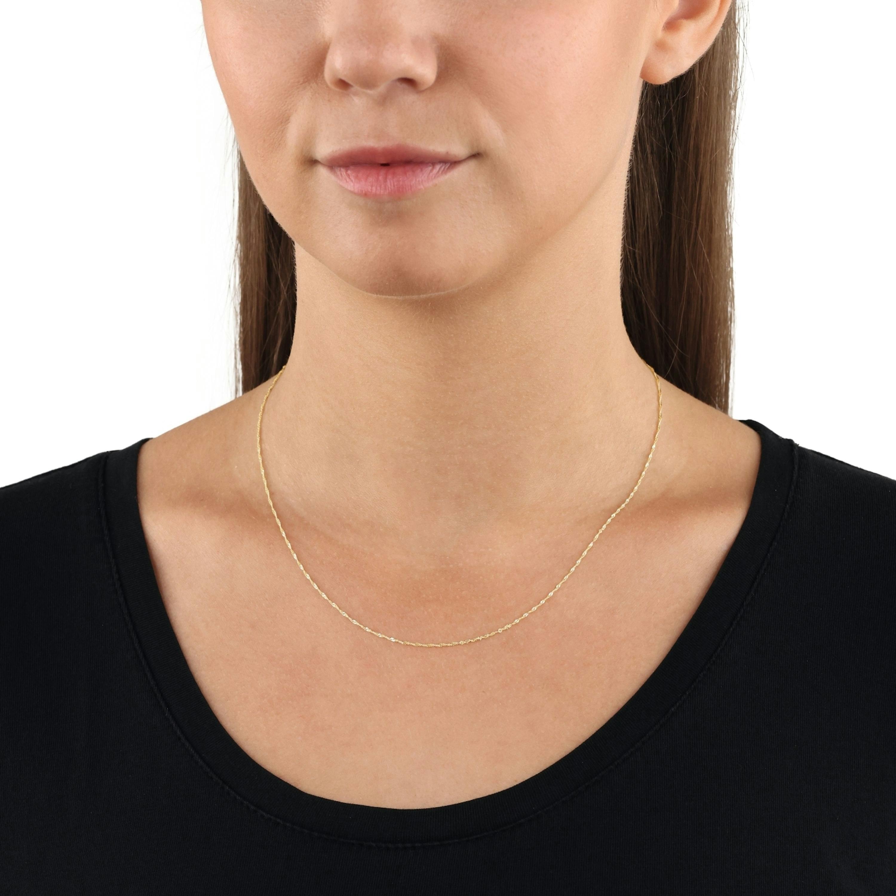 - Die filigrane Singapur-Kette für Frauen aus Gold überzeugt im zeitlosen Design. Die Kette kann als Collier getragen oder mit einem Anhänger kombiniert werden. Kommt in passender Schmuckbox