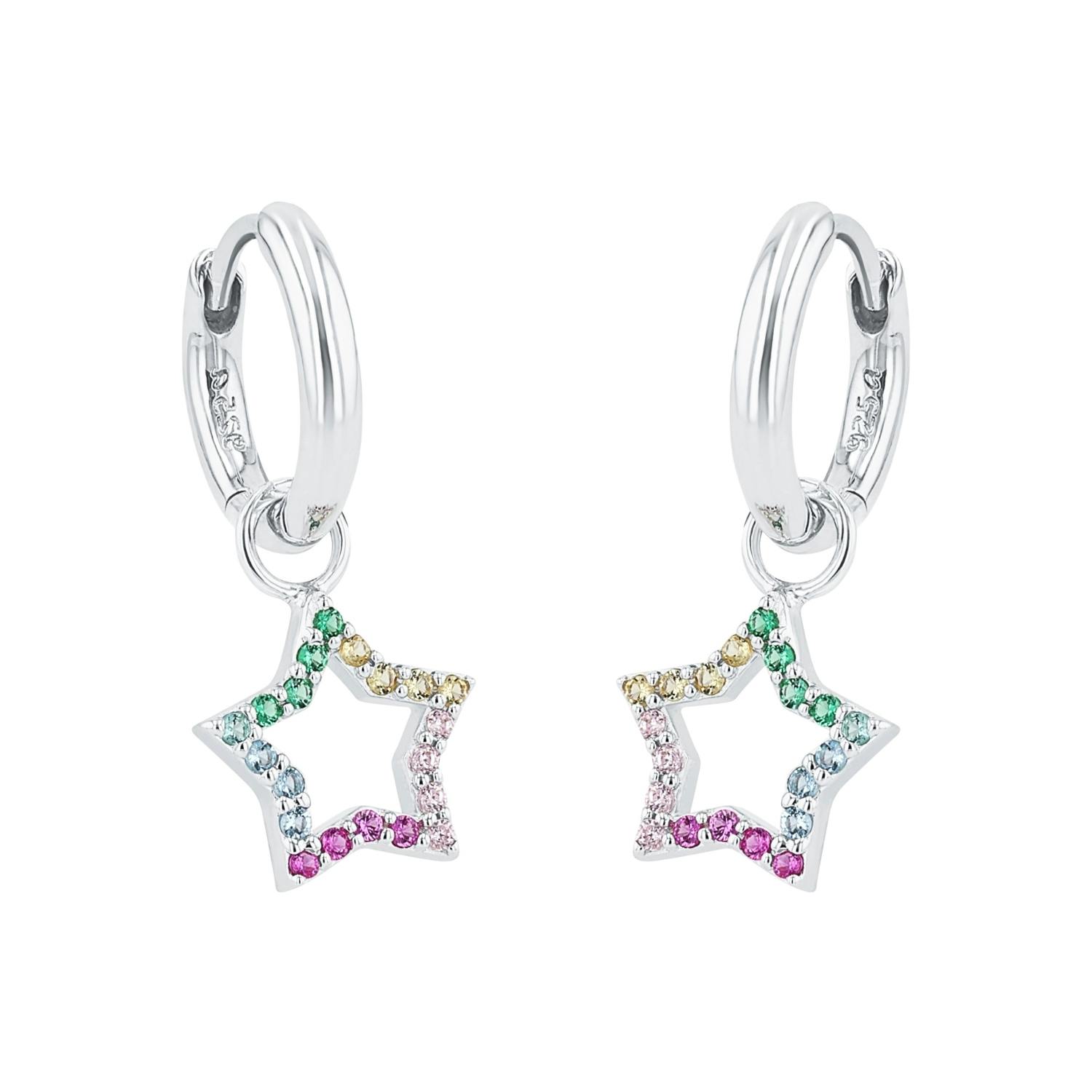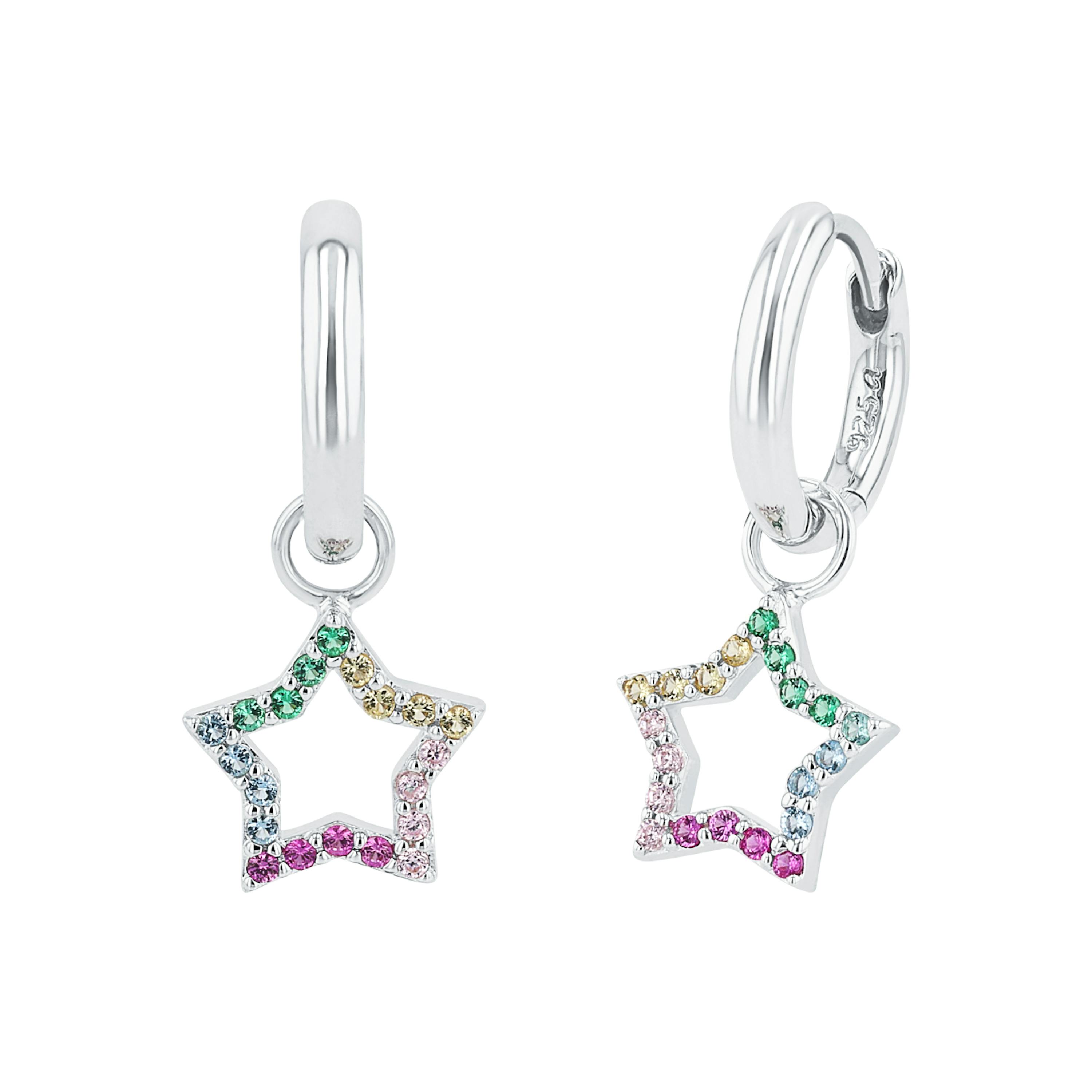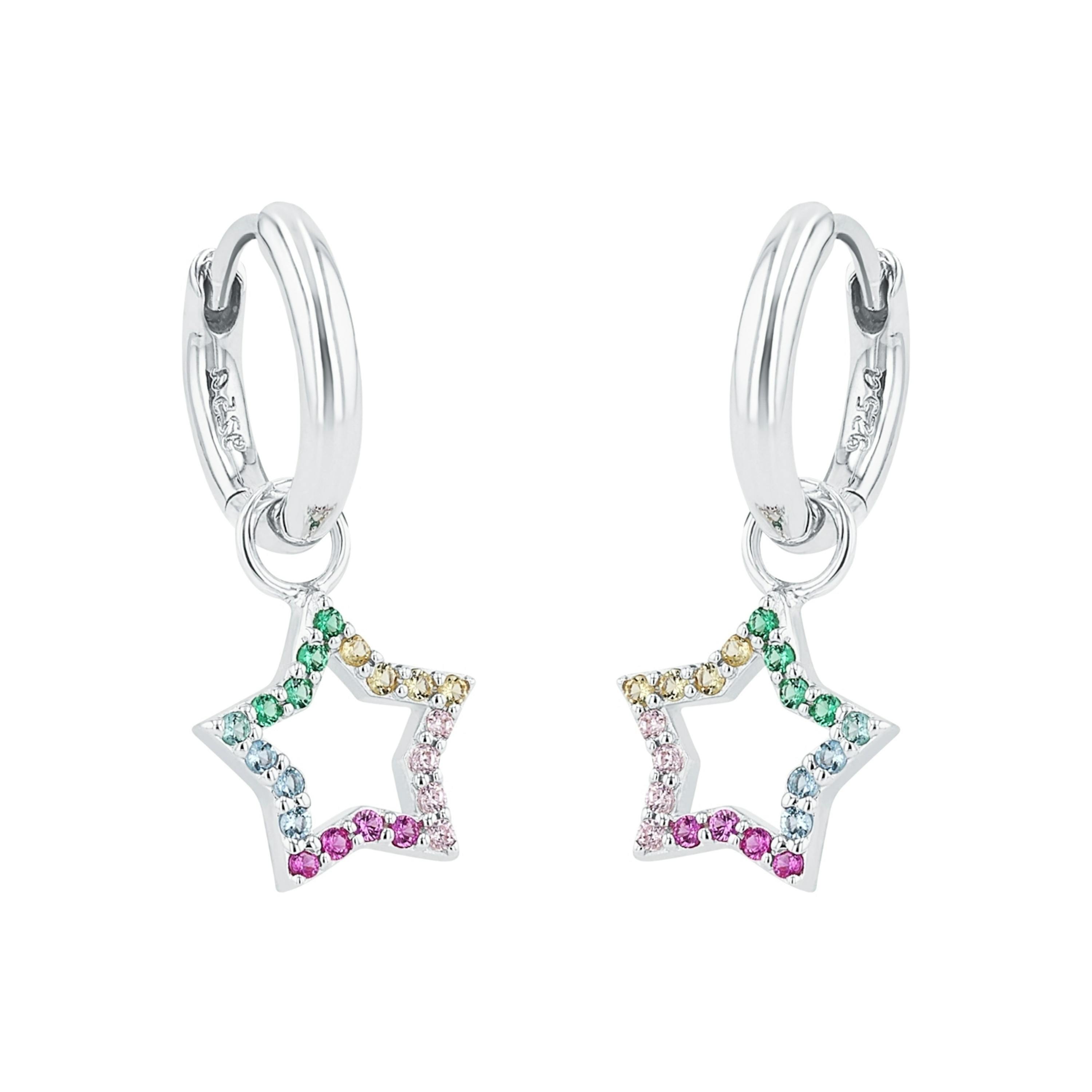 Mit funkelnden Zirkonia (synth.) besetzt, strahlen diese Ohrhänger mit Sternanhänger zum Thema "Rainbow" ganz besonders schön. Die Ohrringe sind aus 925 Sterling Silber gefertigt und praktisch mit einem Scharnierverschluss zu verschließen.