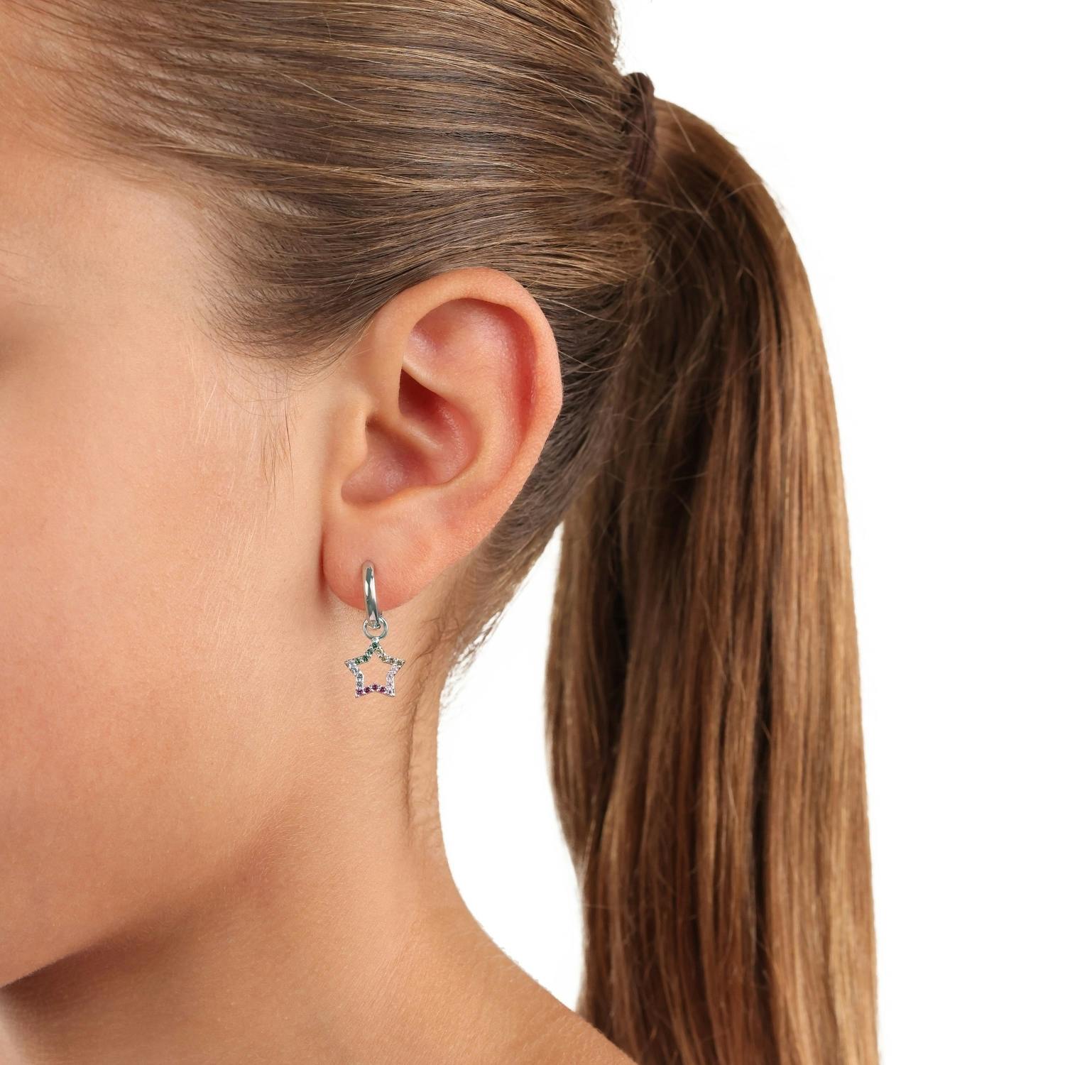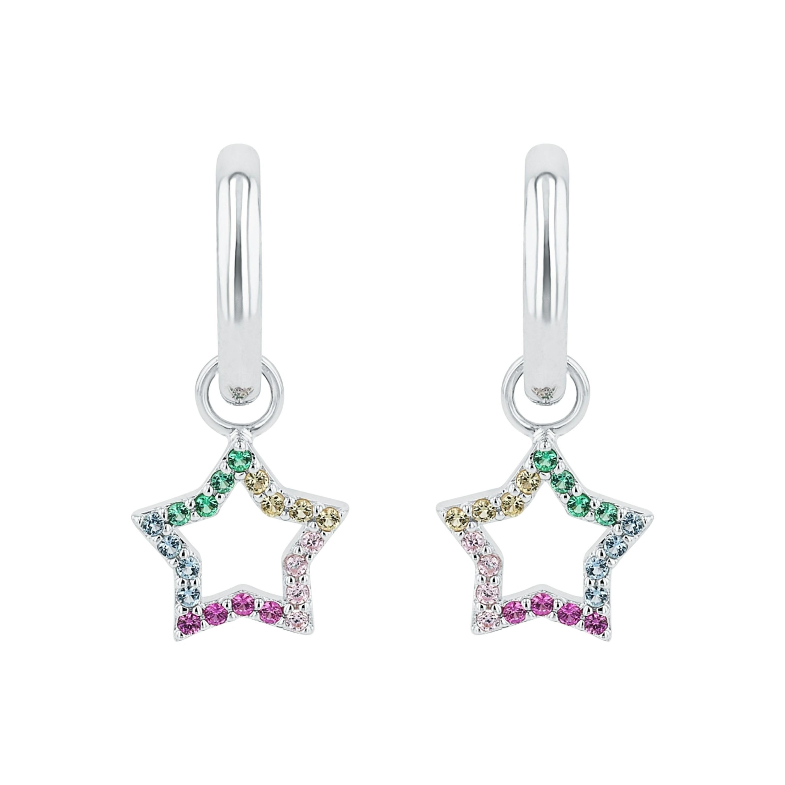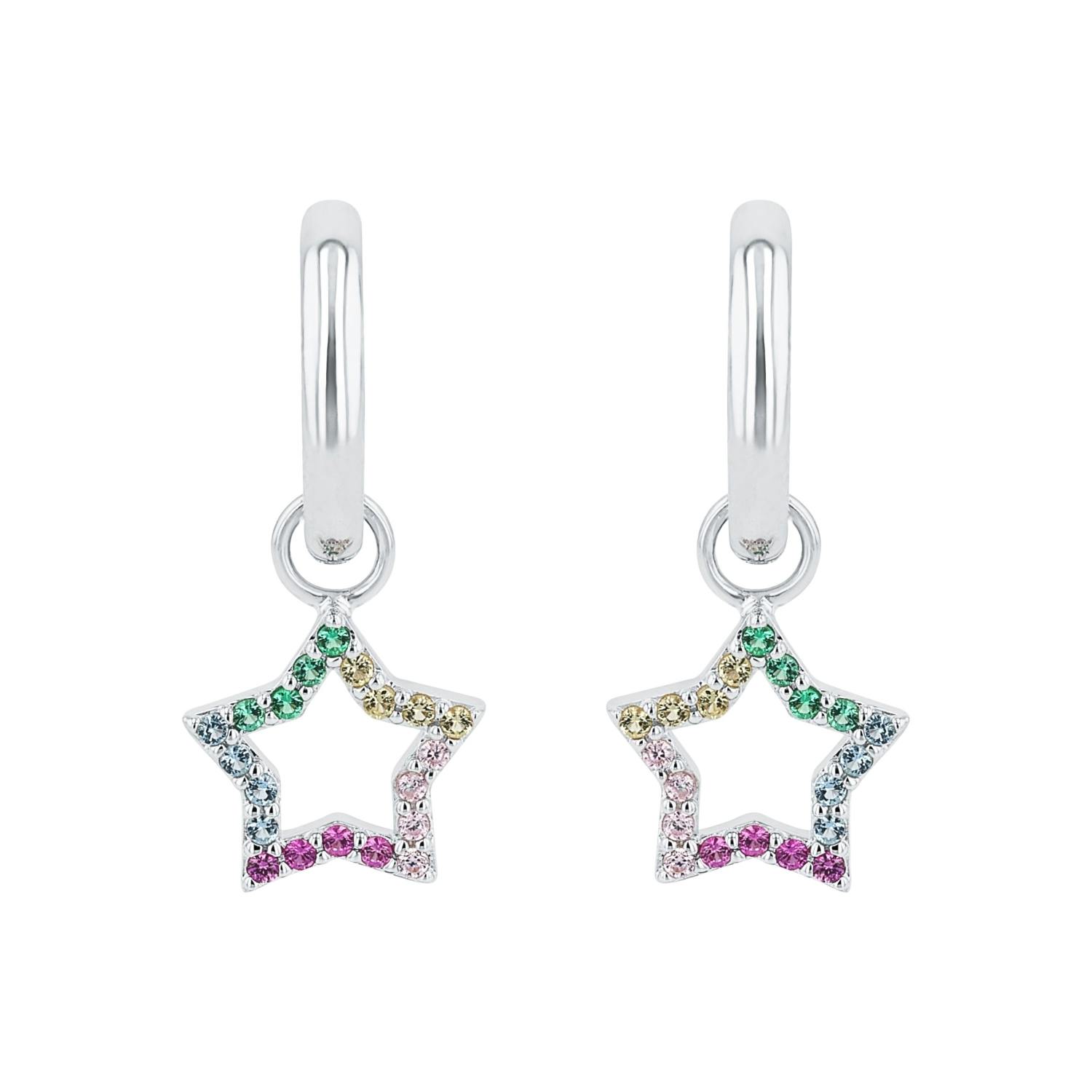 Mit funkelnden Zirkonia (synth.) besetzt, strahlen diese Ohrhänger mit Sternanhänger zum Thema "Rainbow" ganz besonders schön. Die Ohrringe sind aus 925 Sterling Silber gefertigt und praktisch mit einem Scharnierverschluss zu verschließen.