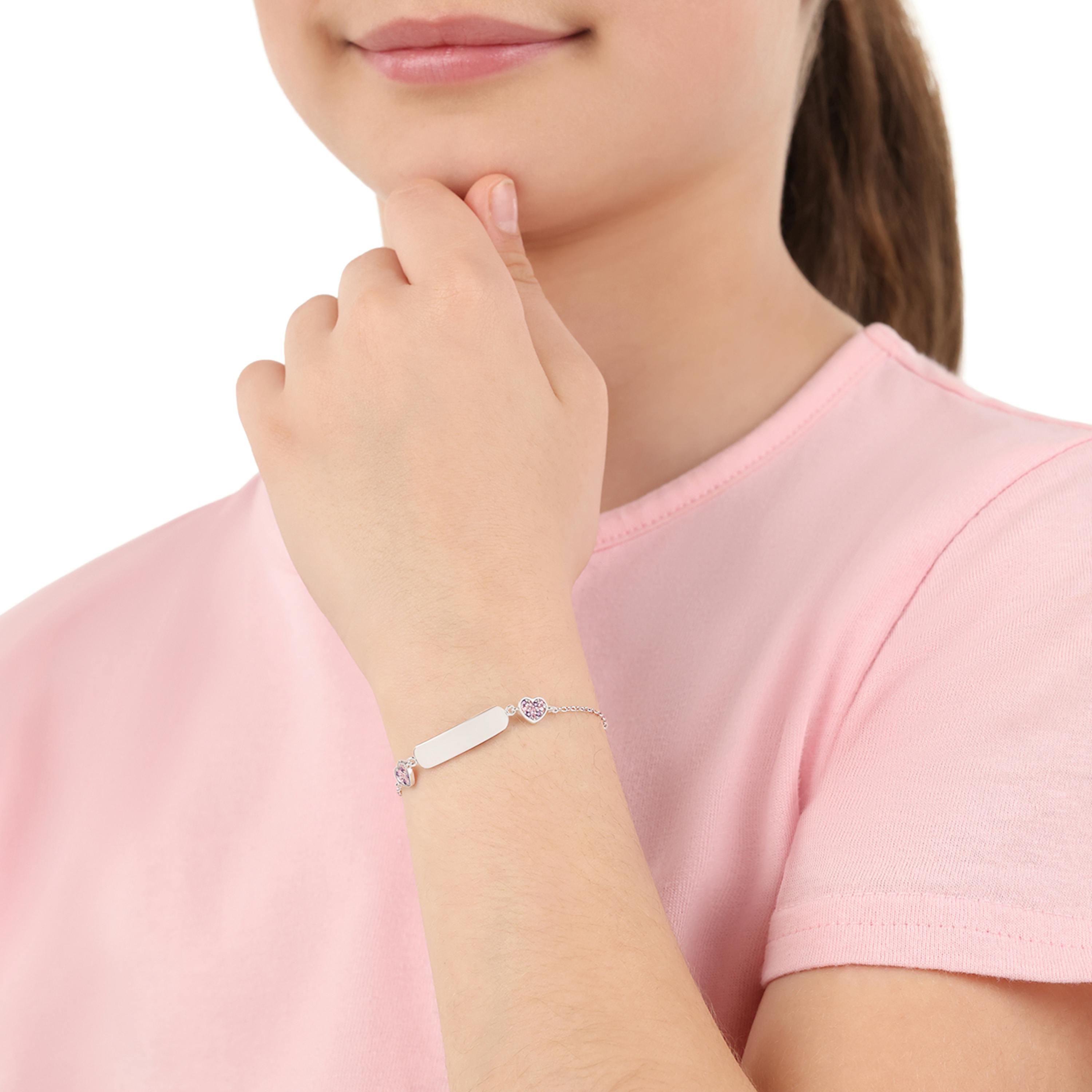Gravierbare Ident Armbänder sind schon lange ein Trendthema bei kleinen Mädchen. Ein besonders schönes Modell ist dieses Armband aus der Prinzessin Lillifee Echtschmuck Kollektion mit bunten Herzen als Highlight. Zirkonia (synth.) runden das Design ab. Das Armband ist aus 925 Sterling Silber gefertigt. Die Identplatte kann je nach Belieben mit einer persönlichen Gravur versehen werden.