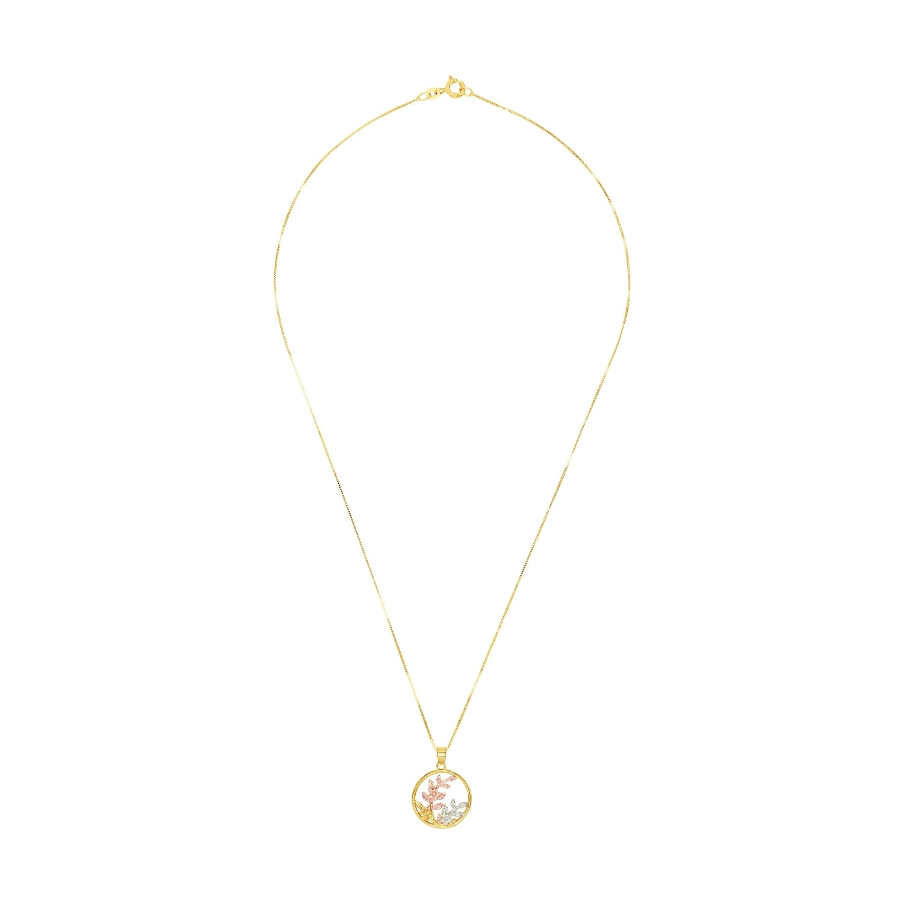 Diese Halskette drückt mit seinem floralen Anhänger pure Naturverbundenheit aus! Der runde Anhänger wird im Inneren von farbigen rankenden Blumen und Blättern, wodurch sich ein modischer tricolor Look entsteht. Die 45 cm lange Venezianerkette wie auch der Anhänger sind aus hochwertigem 585er Gelbgold gefertigt. Die Kette lässt sich dank eines Federrings sicher und einfach schließen und wieder öffnen. Der Anhänger hat die Maße: ca. 22mm x ca. 17 mm