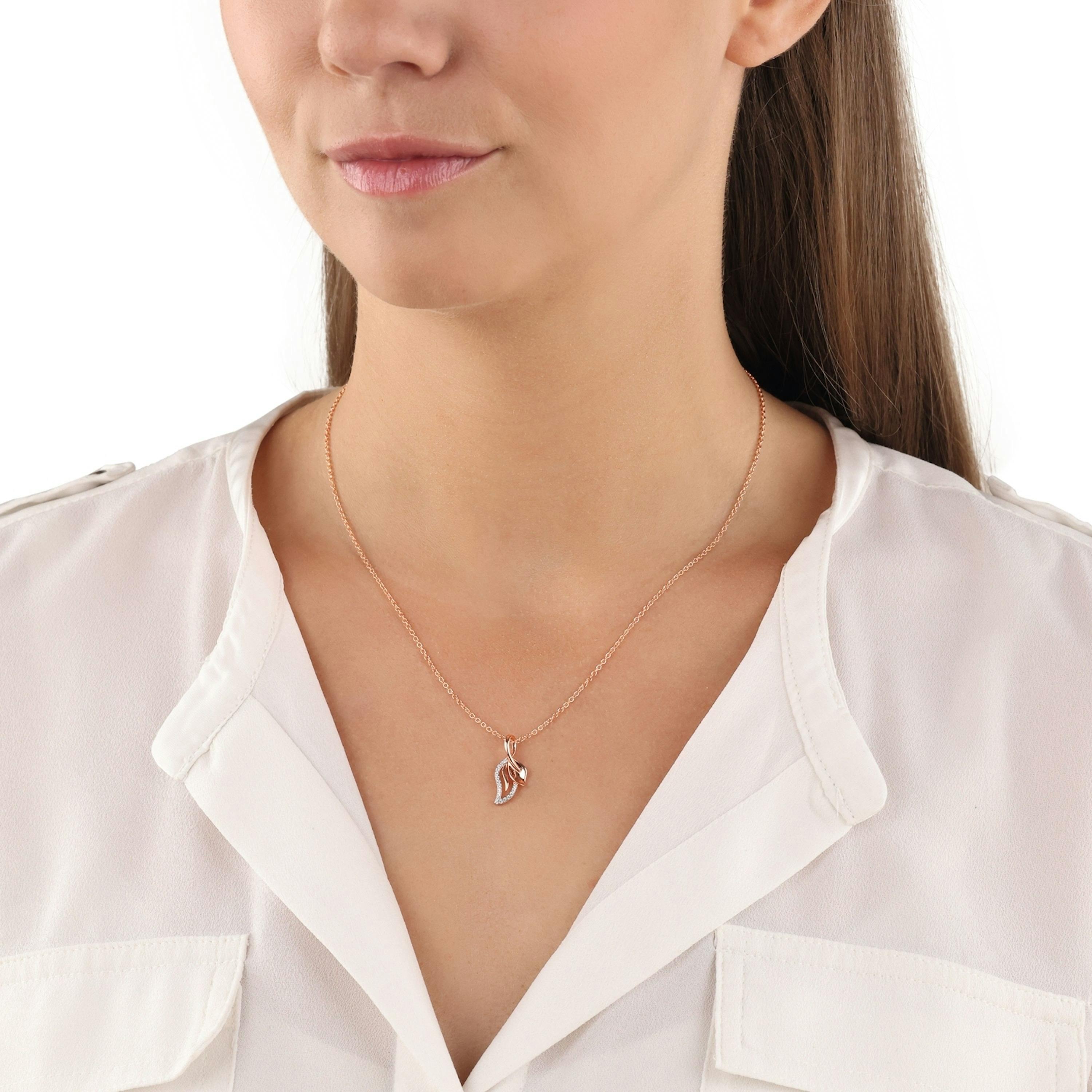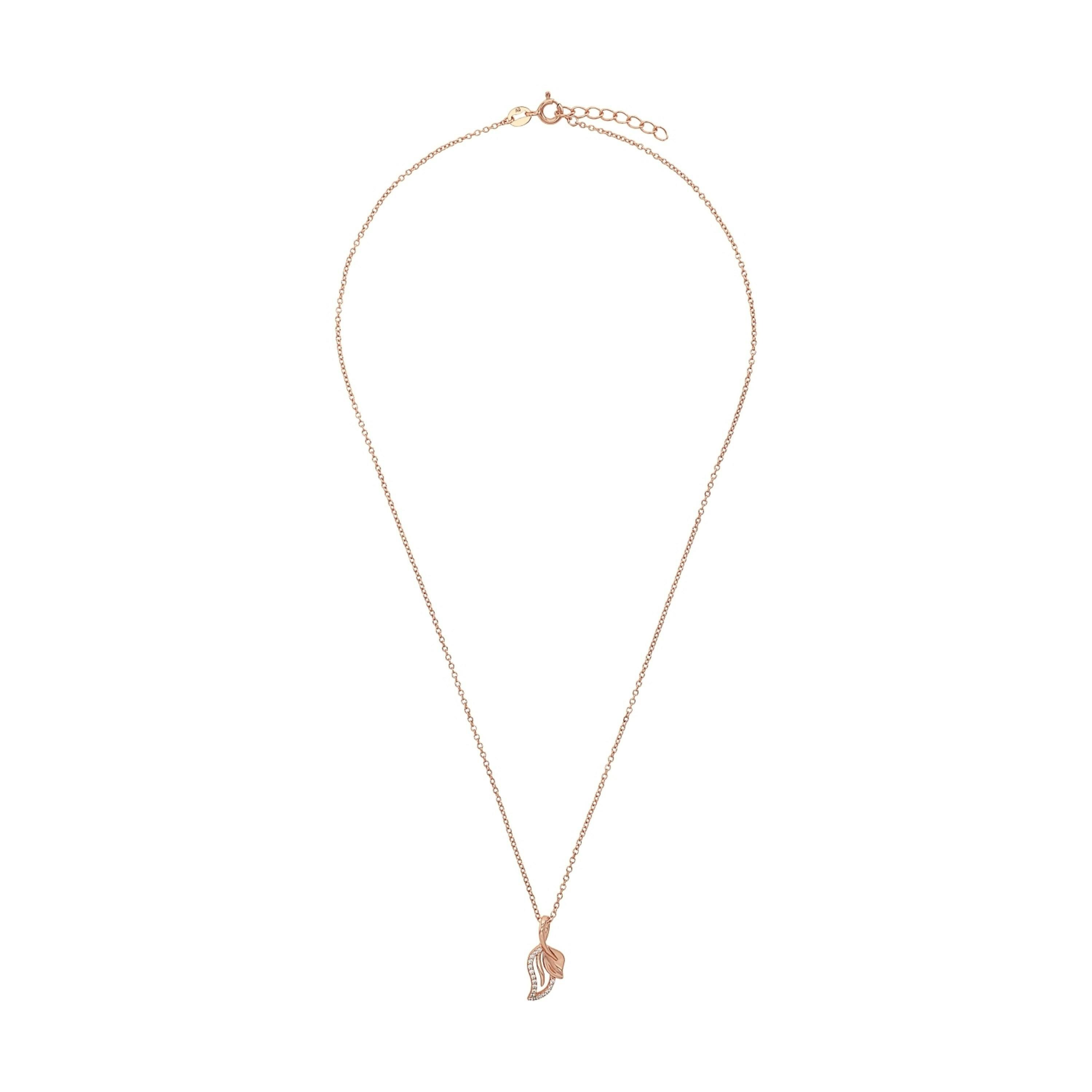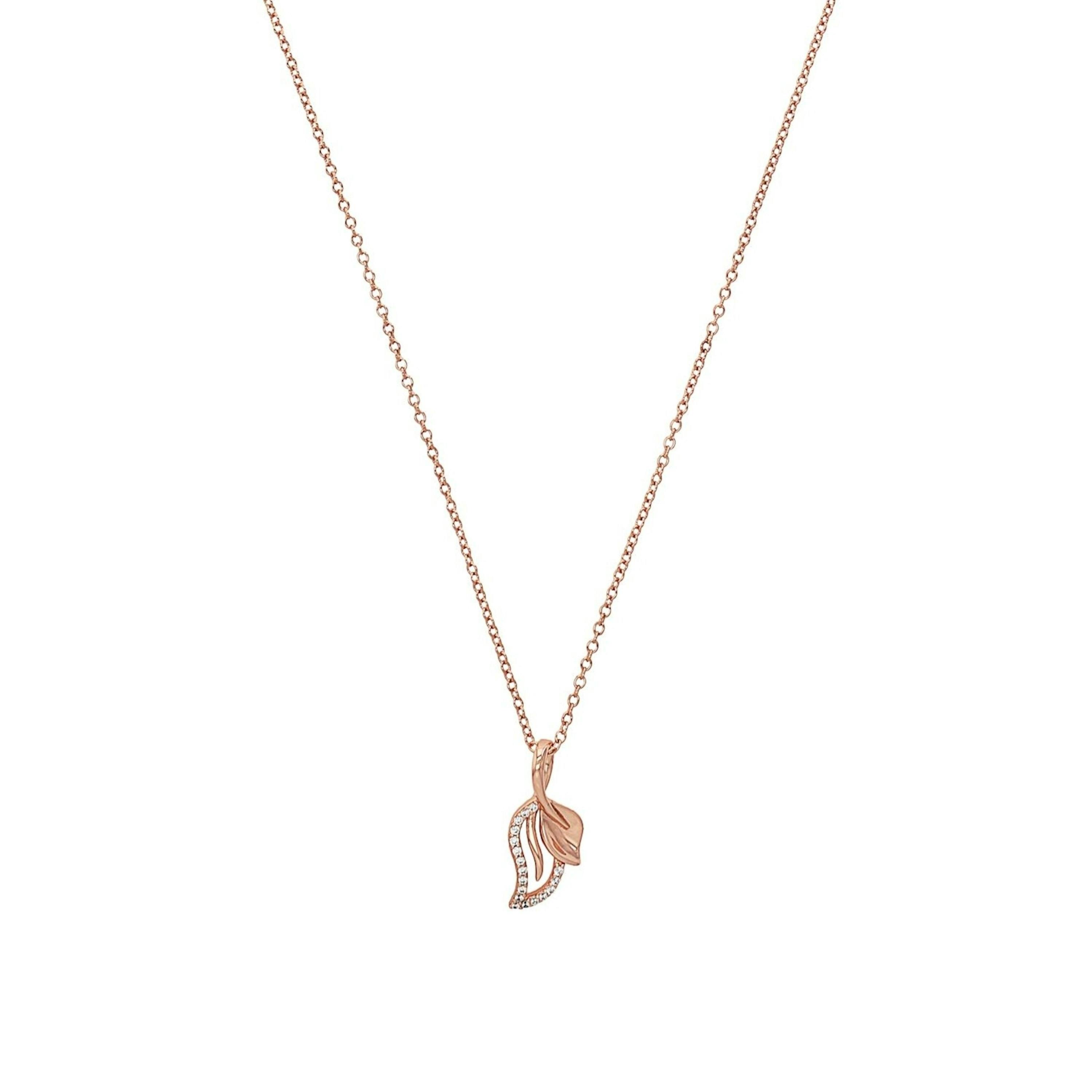 Die 42+3 cm lange Kette erinnert an zwei kleine Blätter. Das eine Blatt ist besetzt mit funkelnden Zirkonia (synth.). Das Schmuckstück lässt sich mit einem Federringverschluss schließen.