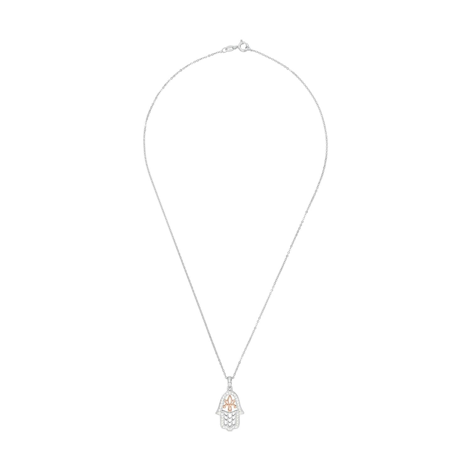 Die Hand der Fatima ist ein wichtiges Schutzsymbol und mittlerweile weltweit verbreitet. An einer Halskette getragen, soll dieser Anhänger nicht nur schmücken, sondern die Trägerin auch an die kulturelle Bedeutung des Zeichens erinnern. Die 45 cm lange Ankerkette und der Anhänger bestehen aus 925 Sterling Silber. Besetzt ist der ca. 3 cm lange Anhänger mit zahlreichen Zirkonia (synth.) .