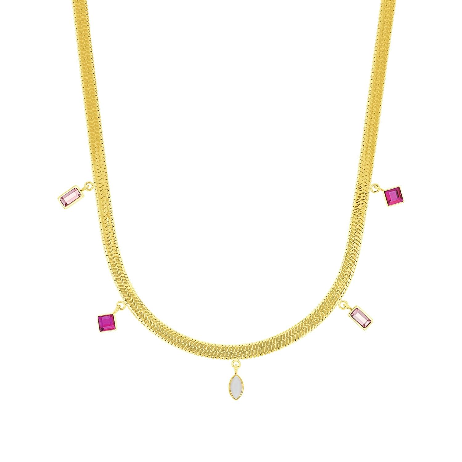 Halskette für Damen. Ein echtes Statement-Piece stellt diese Kette mit Schmucksteinen der Marke Amor dar. Durch die elegante Schlangengliederung schmiegt sich das Schmuckstück angenehm an den Hals der Trägerin. Die fünf Glas Schmucksteine, die als Anhänger in den Verlauf integriert sind, machen die Damenkette aus hochwertigem Edelstahl zu einem echten Hingucker. Die Halskette lässt sich zwischen 42 cm und 45 cm Länge individuell verstellen und durch einen praktischen Karabinerverschluss einfach An- und Ablegen.