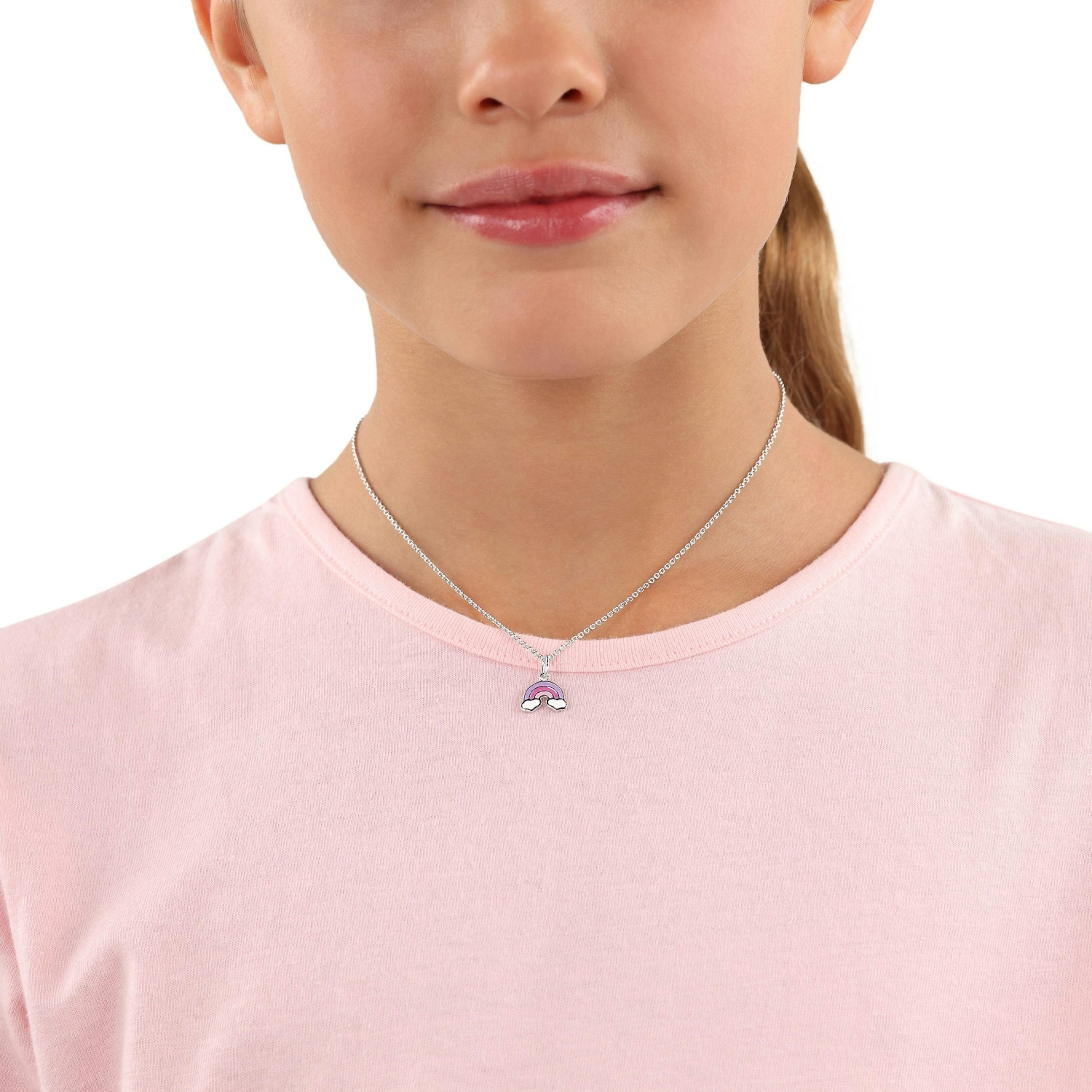 Traumhafte Halskette mit Anhänger für Mädchen von Prinzessin Lillifee. Diese süße Kette mit einem Regenbogen-Motiv als Anhänger ist die perfekte Ergänzung in der Schmuckschatulle deiner kleinen Prinzessin. Das Accessoire wurde aus hochwertigem 925 Sterling Silber gefertigt, wodurch kleine Mädchen noch länger Freude an dem neuen Schmuckstück haben werden. Die Kette für Mädchen lässt sich zwischen 35 cm und 38 cm Länge individuell verstellen. Somit bietet der Halsschmuck nicht nur ein angenehmes Tragegefühl, sondern kann auch mitwachsen. Für einen sicheren Halt und ein einfaches An- und Ablegen sorgt ein praktischer Karabinerverschluss. Die Halskette für Kinder lässt sich gerne mit weiteren Schmuckstücken kombinieren. So auch mit den passenden Ohrsteckern. Die Mädchenkette kommt in einer verspielten Schmuckbox und eignet sich auch perfekt als Geschenk.