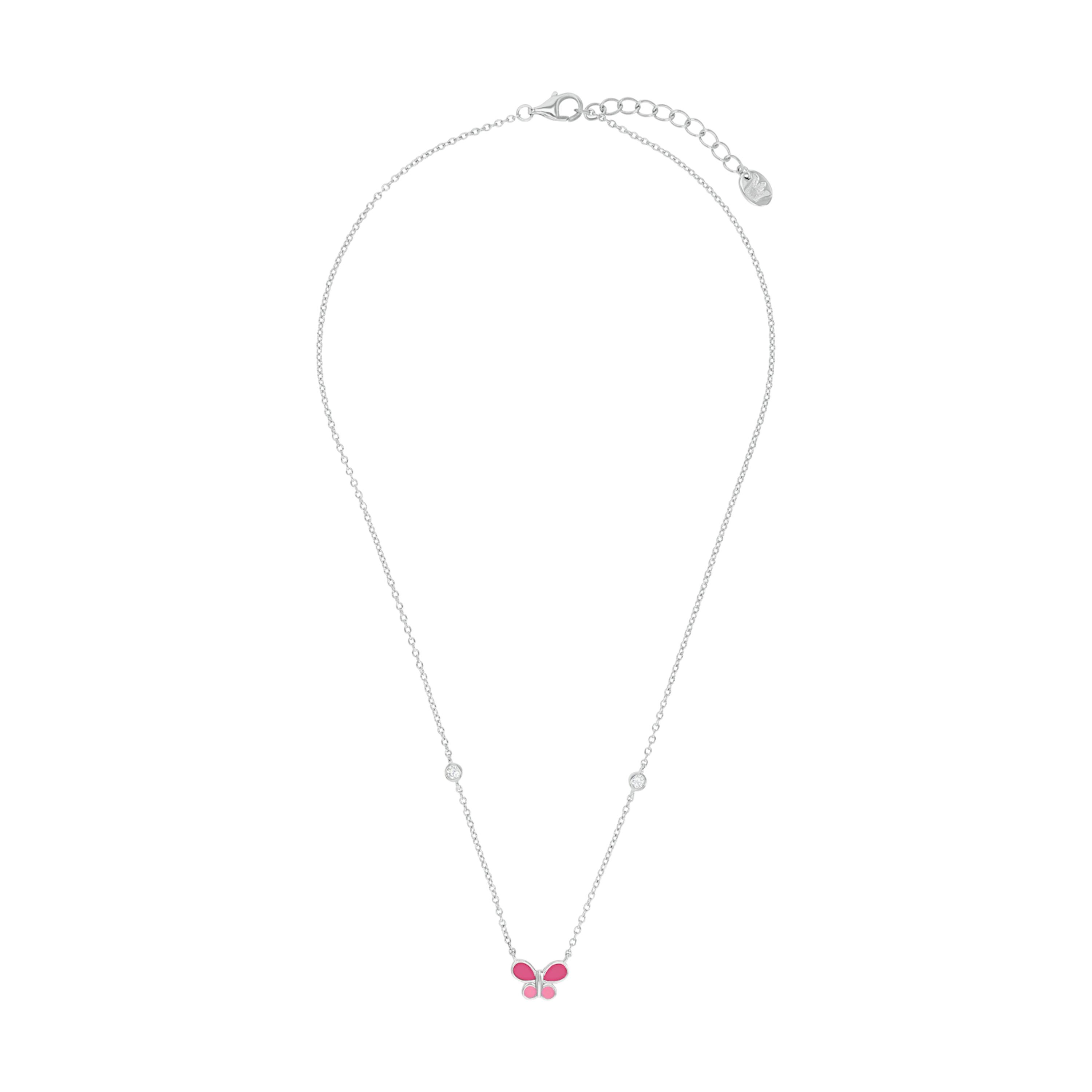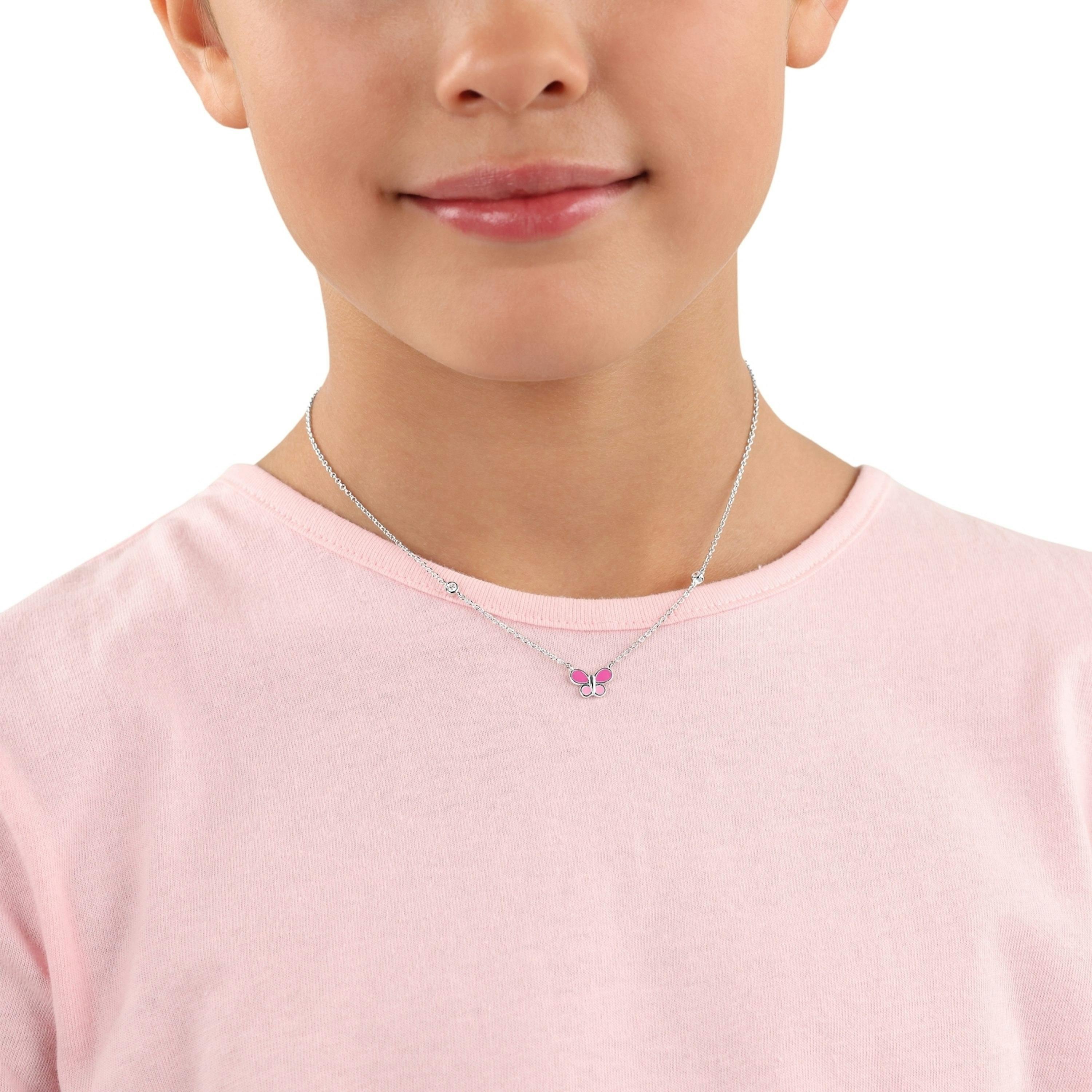 Niedliche Halskette mit Schmetterling-Anhänger für Mädchen von Prinzessin Lillifee. Diese tolle Kette der Marke Prinzessin Lillifee ist das Lieblingsstück kleiner Feen. Das Schmuckstück wurde aus hochwertigem 925 Sterling Silber gefertigt, wodurch deine kleine Prinzessin noch länger Freude an dem Accessoire haben wird. Zwei, in die Rundankerkette eingearbeitete, strahlende Zirkoniasteine (synth.) sorgen für das extra Funkeln. Die Flügel des süßen Schmetterlings sind mit einer Emaille versehen. Die Kette lässt sich zwischen 35 cm und 38 cm Länge individuell verstellen. Somit bietet der Halsschmuck für Mädchen nicht nur ein angenehmes Tragegefühl sondern kann auch mitwachsen. Für einen sicheren Halt und ein einfaches An- und Ablegen sorgt ein praktischer Karabinerverschluss. Die Kinderhalskette lässt sich gerne mit weiteren Schmuckstücken kombinieren, beispielsweise dem passenden Armband oder den passenden Ohrsteckern.