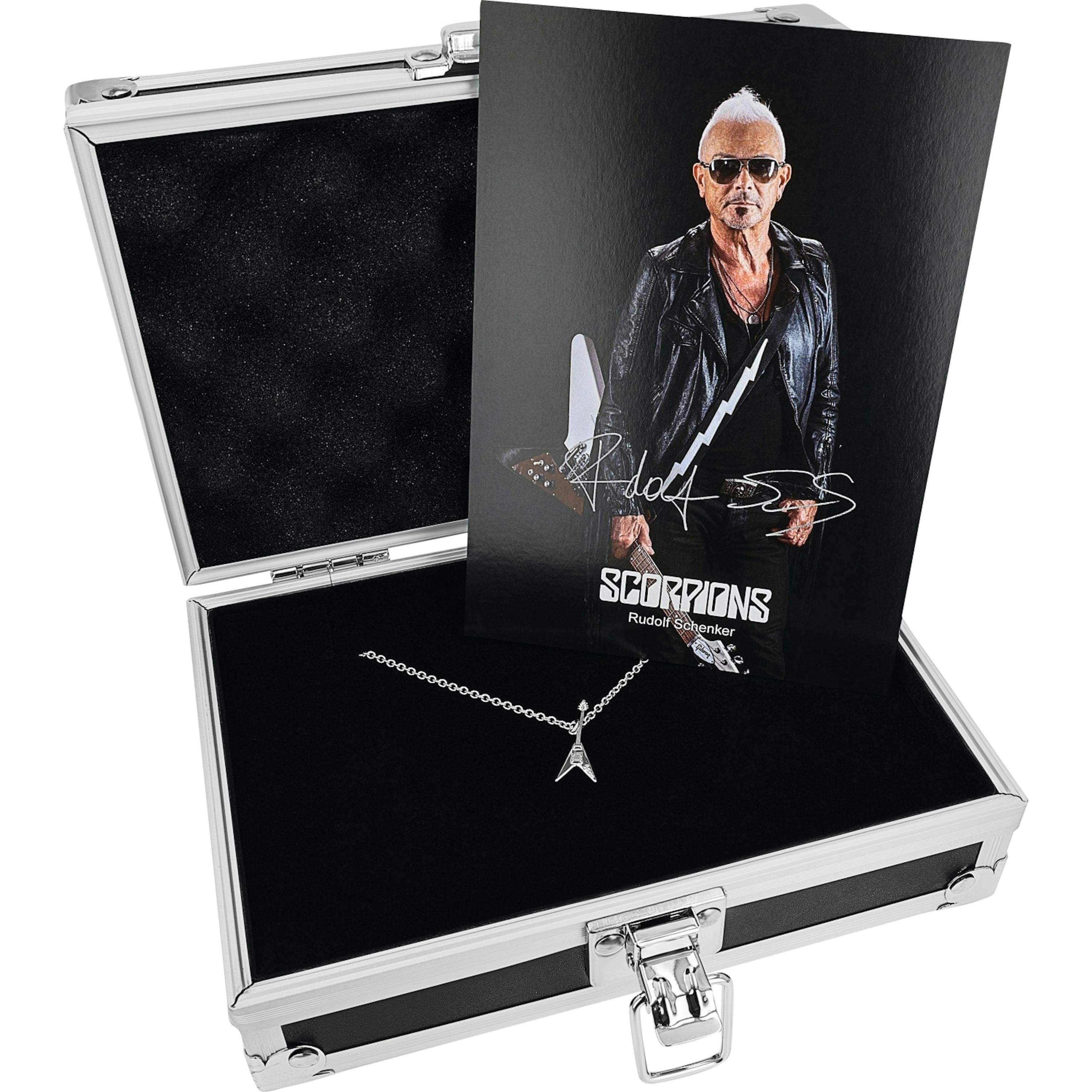 Scorpions Unisex Schmuckstücke by Amor Echtschmuck. Die limitierte Box umfasst eine beliebige – von dir gewählte – Kette der fünf Band Mitglieder: Klaus, Rudolf, Matthias, Mikkey und Pawel. Außerdem mit dabei eine tolle Autogrammkarte. Die Alu-Box beinhaltet ein schwarzes Schaumstoff-Inlay, sodass dein Schmuckstück gut gepolstert ist und sicher aufbewahrt wird. Natürlich kannst du dieses hochwertige Case mit Scorpions Logo auch umfunktionieren. Jede Kette besteht aus erstklassigem 925 Sterling Silber und zeigt auf dem Anhänger eine individuelle Lasergravur des Anfangsbuchstabens deines Lieblings-Scorpions. Die Unisex Halskette mit Gitarren-Anhänger ist längenverstellbar zwischen 45+5 cm und gefällt in einer Rundankergliederung mit Karabinerverschluss.