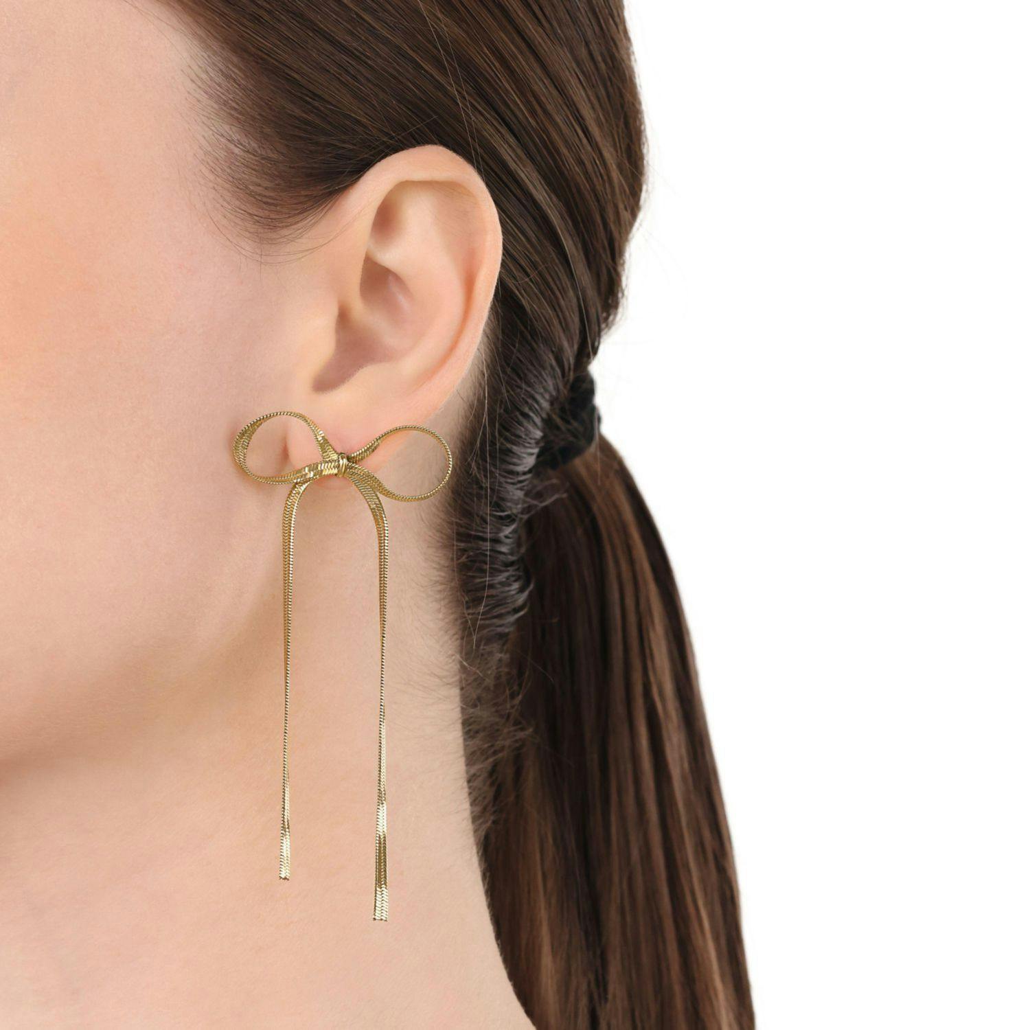 Edles Accessoire für modebewusste Schmuckliebhaber: Ohrhänger für Damen von Amor. Die Echtschmuckmarke Amor steht für Schmuck, der auf höchstem Niveau verarbeitet ist. Fein ausgesuchte Materialien sowie elegante Designs machen das Sortiment einzigartig. Die hübschen Ohrringe bestehen aus hochwertigem Edelstahl und lassen sich durch den praktischen Steckverschluss einfach und zuverlässig schließen. Ein Schleife-Motiv ist hierbei der Blickfang des Ohrschmucks. Die glänzenden Ohrhänger haben eine markante Länge von ca. 90 mm. Hierdurch ist ein auffälliger Look garantiert. Das Amor Schmuckstück wird in einer passenden Verpackung geliefert, die sich ideal zum Aufbewahren oder auch Verschenken eignet.