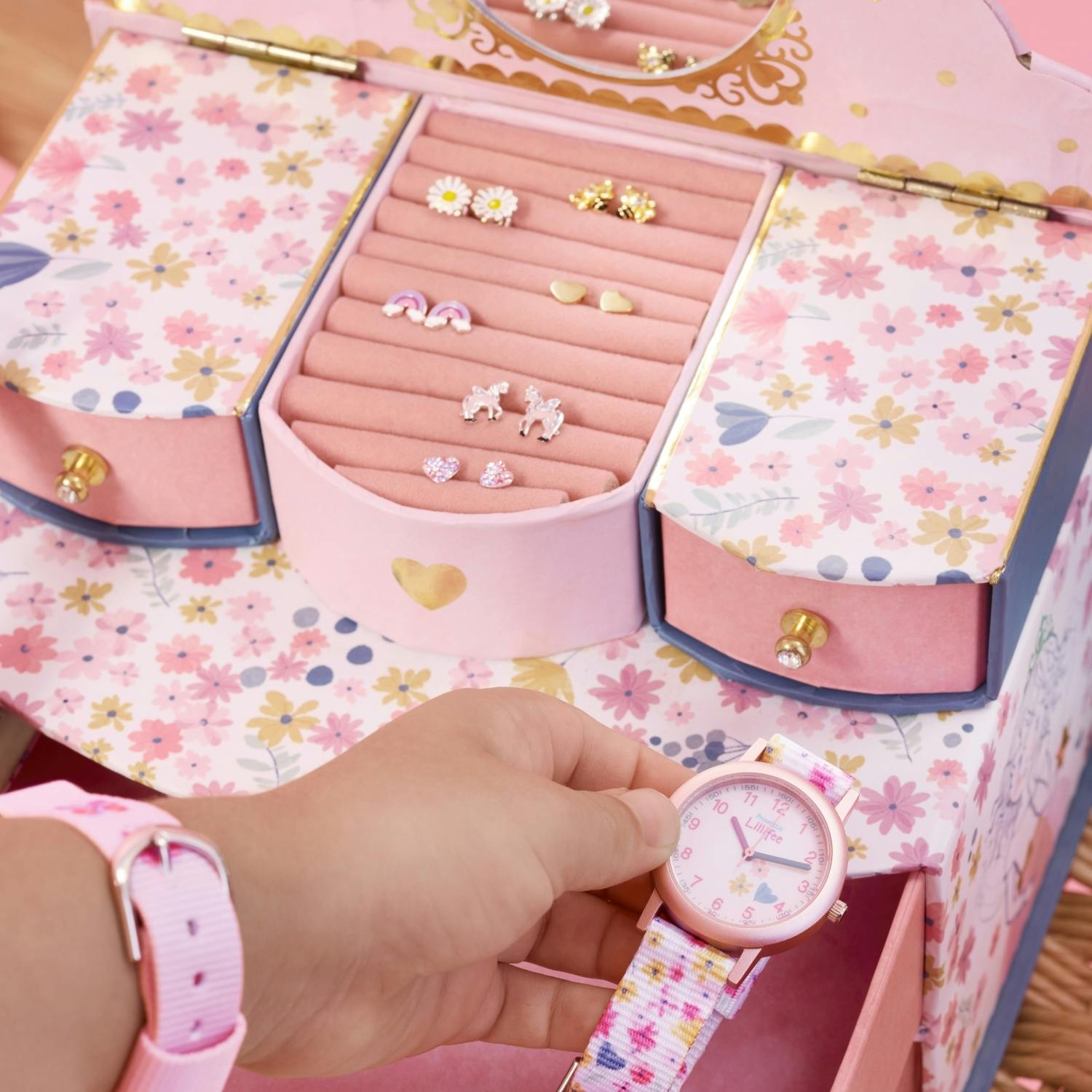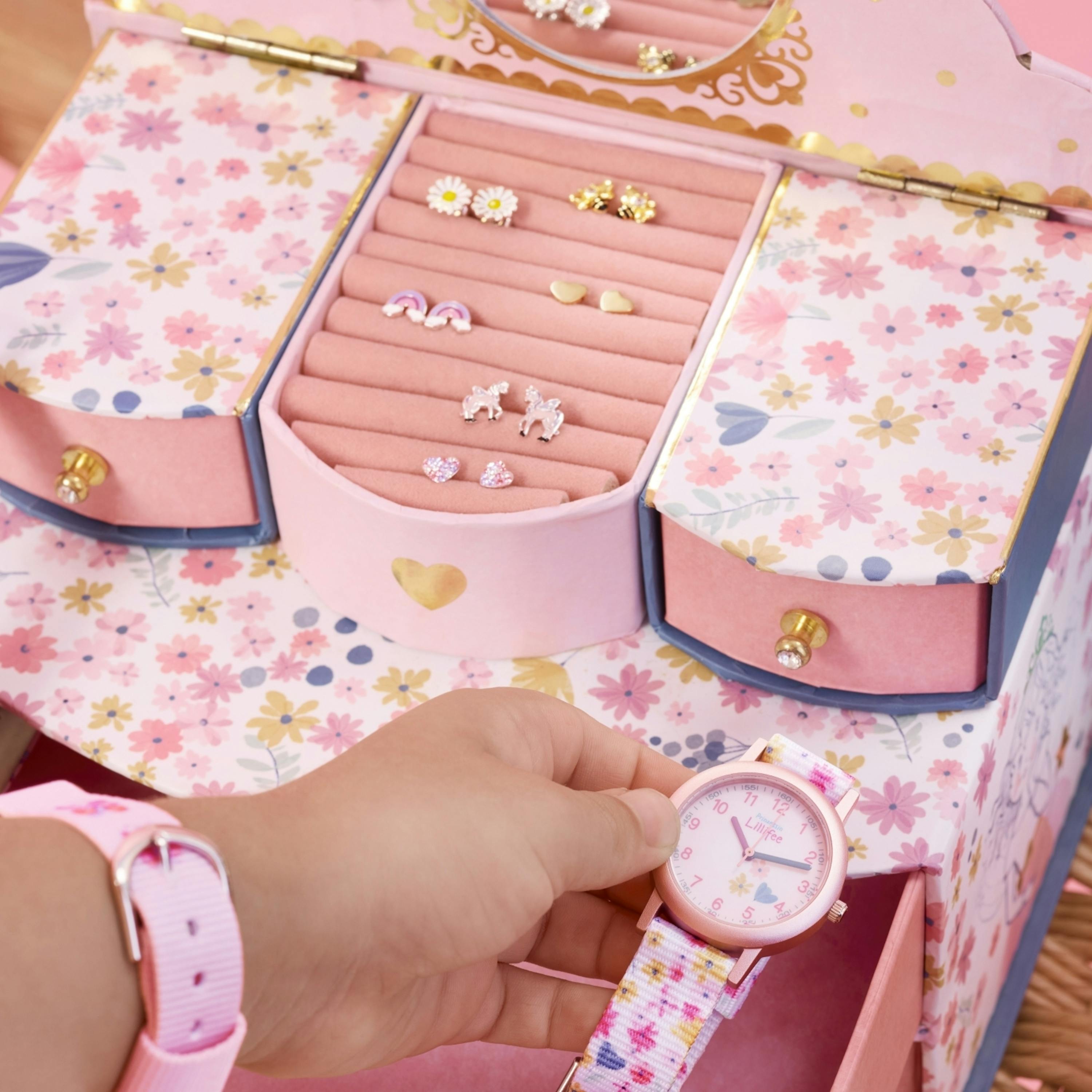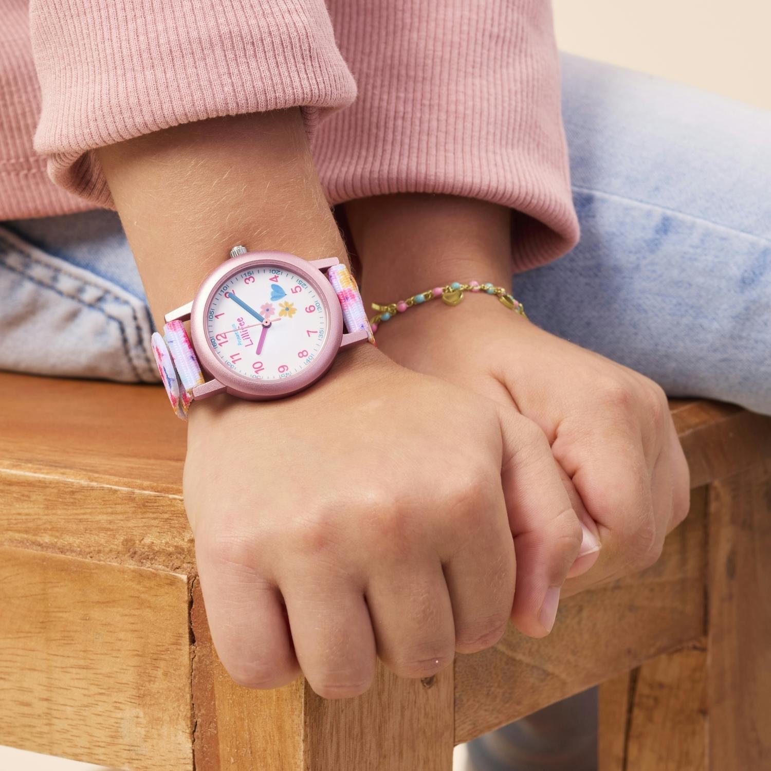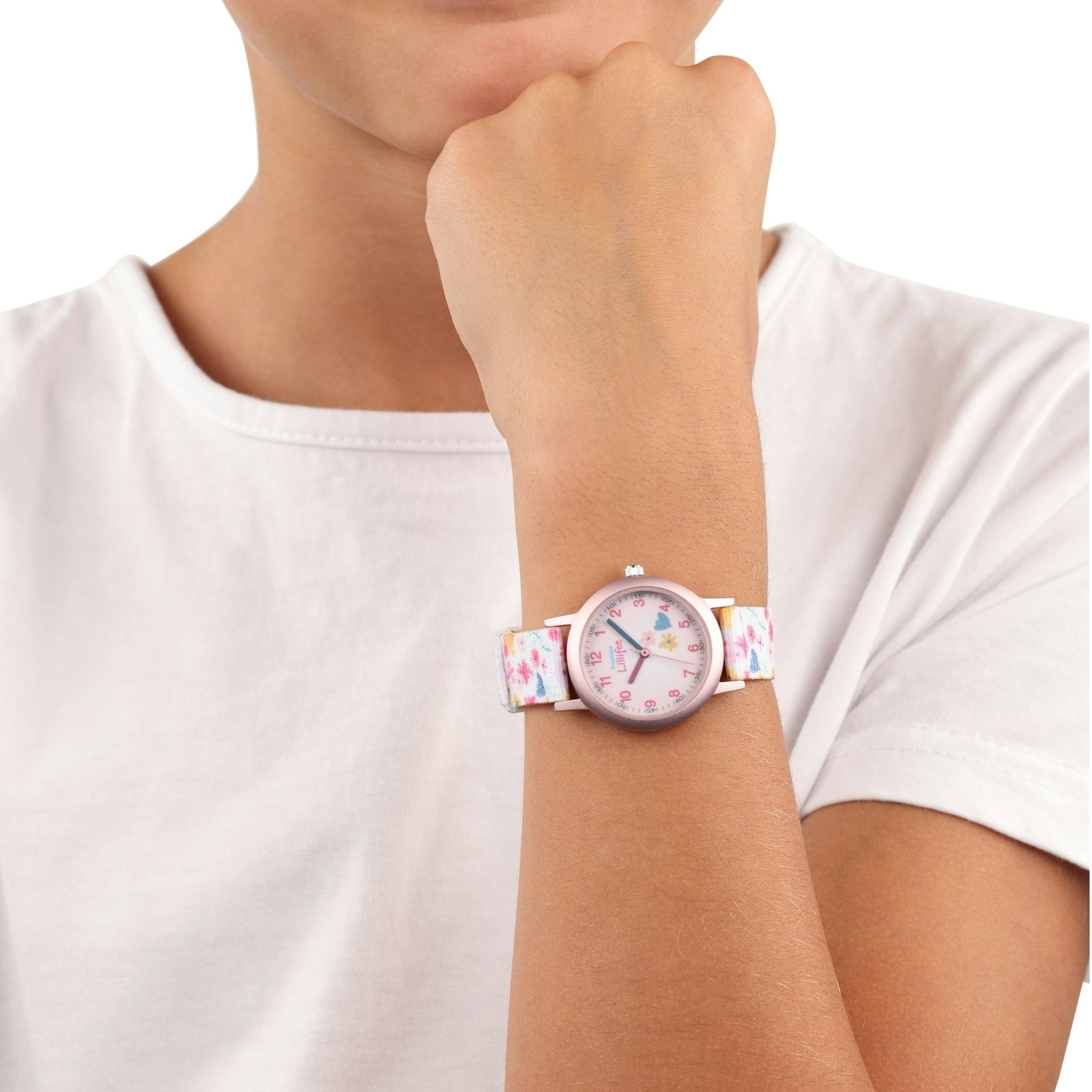 - Mädchenuhr mit floralen Motiven und Lernziffernblatt aus Mineralglas