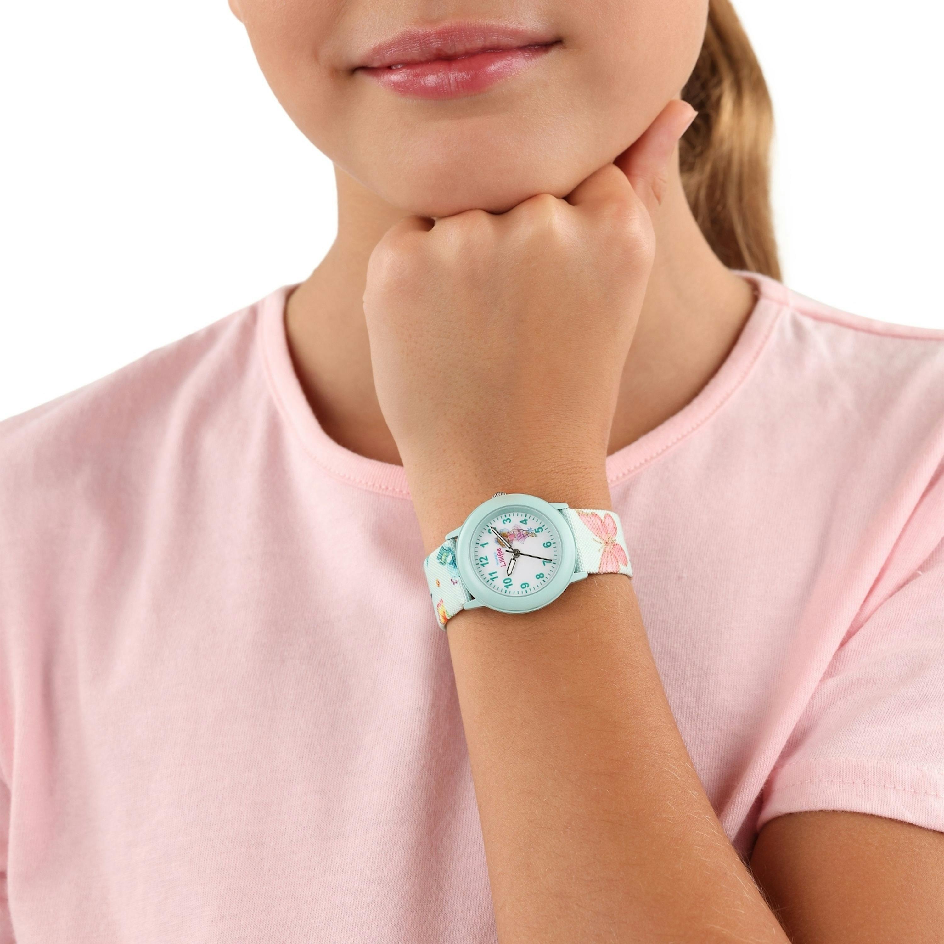 Willkommen in der Uhren Welt von Prinzessin Lillifee. Hier zeigen sich fröhliche Farben, bunte Motive und wichtiger Lernspaß für kleine Mädchen. Die perfekte Armbanduhr, die mitwächst und dabei den Gute-Laune-Faktor ans Outfit zaubert. Das matt gestaltete Gehäuse besteht aus hochwertigem Alloy und ist mit einem Farbspray veredelt. Die Krone, die zum Stellen der Uhr dient, besteht aus Edelstahl. Das längenverstellbare Textilarmband mit Tier- und Naturmotiven überzeugt durch die einfache Handhabe der Dornschließe. Hiermit lässt sich die Länge des Bands genau passend für das Handgelenk einstellen. Das kratzfeste Mineraglas schützt das fröhlich bunte Ziffernblatt, das die Zahlen deutlich inklusive Sekunden dazwischen anzeigt. Ein präzises Citizen Miyota Uhrwerk ist bis auf drei Bar wasserdicht und somit Spritzwassergeschützt. Jede Lillifee Uhr wird mit einer süßen Schatulle geliefert und eignet sich ideal als Geschenk.