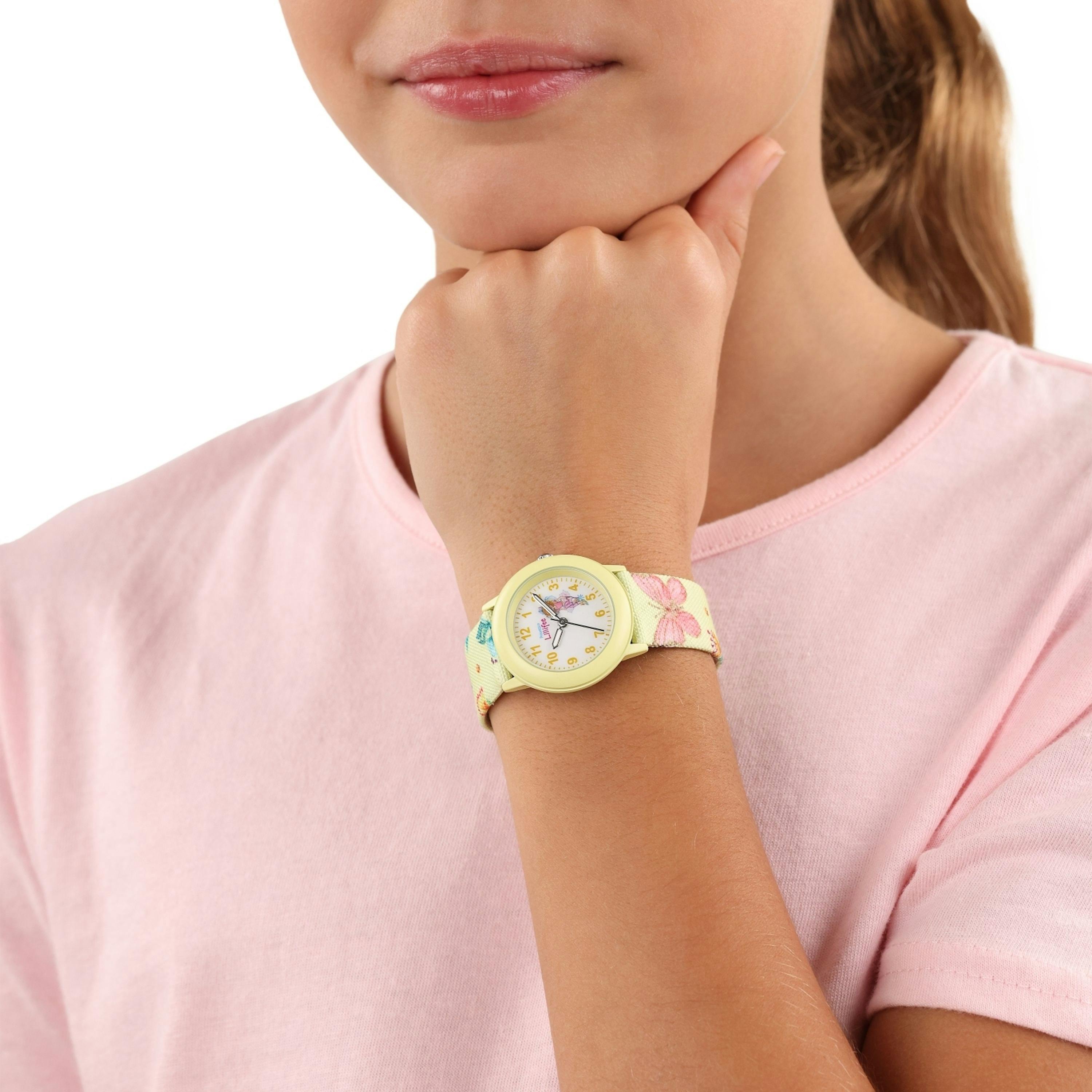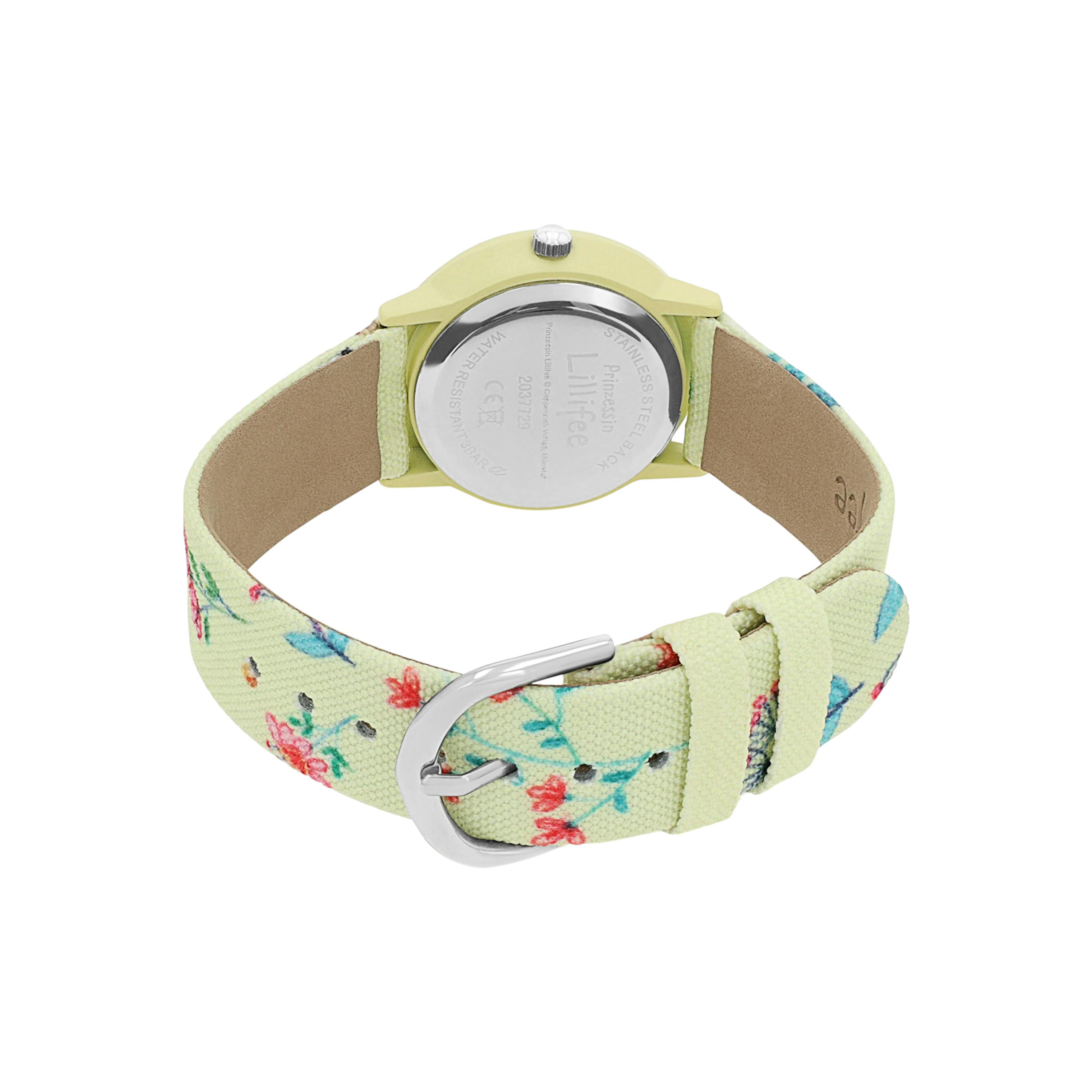 Willkommen in der Uhren Welt von Prinzessin Lillifee. Hier zeigen sich fröhliche Farben, bunte Motive und wichtiger Lernspaß für kleine Mädchen. Die perfekte Armbanduhr, die mitwächst und dabei den Gute-Laune-Faktor ans Outfit zaubert. Das matt gestaltete Gehäuse besteht aus hochwertigem Alloy und ist mit einem Farbspray veredelt. Die Krone, die zum Stellen der Uhr dient, besteht aus Edelstahl. Das längenverstellbare Textilarmband mit Tier- und Naturmotiven überzeugt durch die einfache Handhabe der Dornschließe. Hiermit lässt sich die Länge des Bands genau passend für das Handgelenk einstellen. Das kratzfeste Mineraglas schützt das fröhlich bunte Ziffernblatt, das die Zahlen deutlich inklusive Sekunden dazwischen anzeigt. Ein präzises Citizen Miyota Uhrwerk ist bis auf drei Bar wasserdicht und somit Spritzwassergeschützt. Jede Lillifee Uhr wird mit einer süßen Schatulle geliefert und eignet sich ideal als Geschenk.