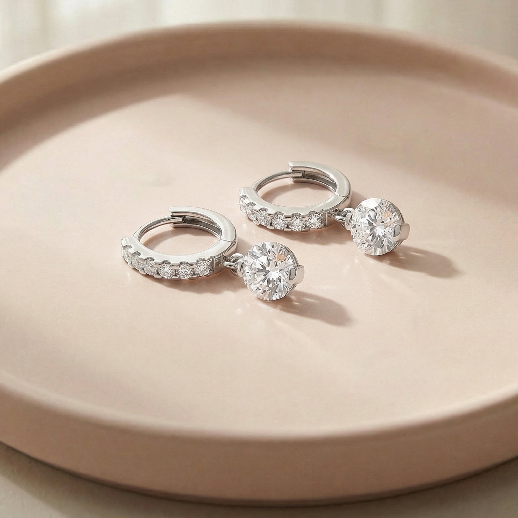 Dieser wunderschöne Ohrschmuck besteht aus 925 Sterling Silber und vielen Zirkonia (synth.), die an der kleine Creole befestigt sind.