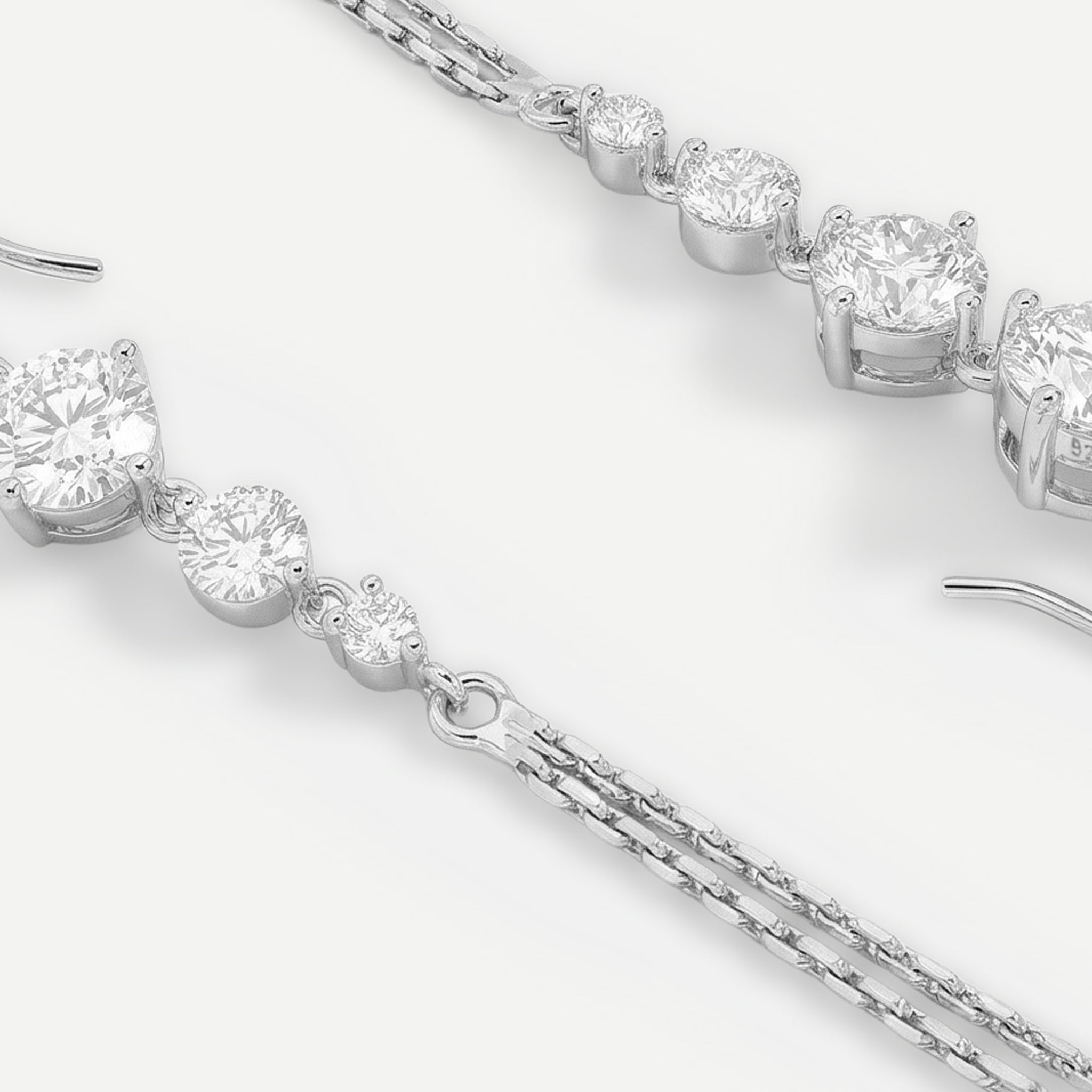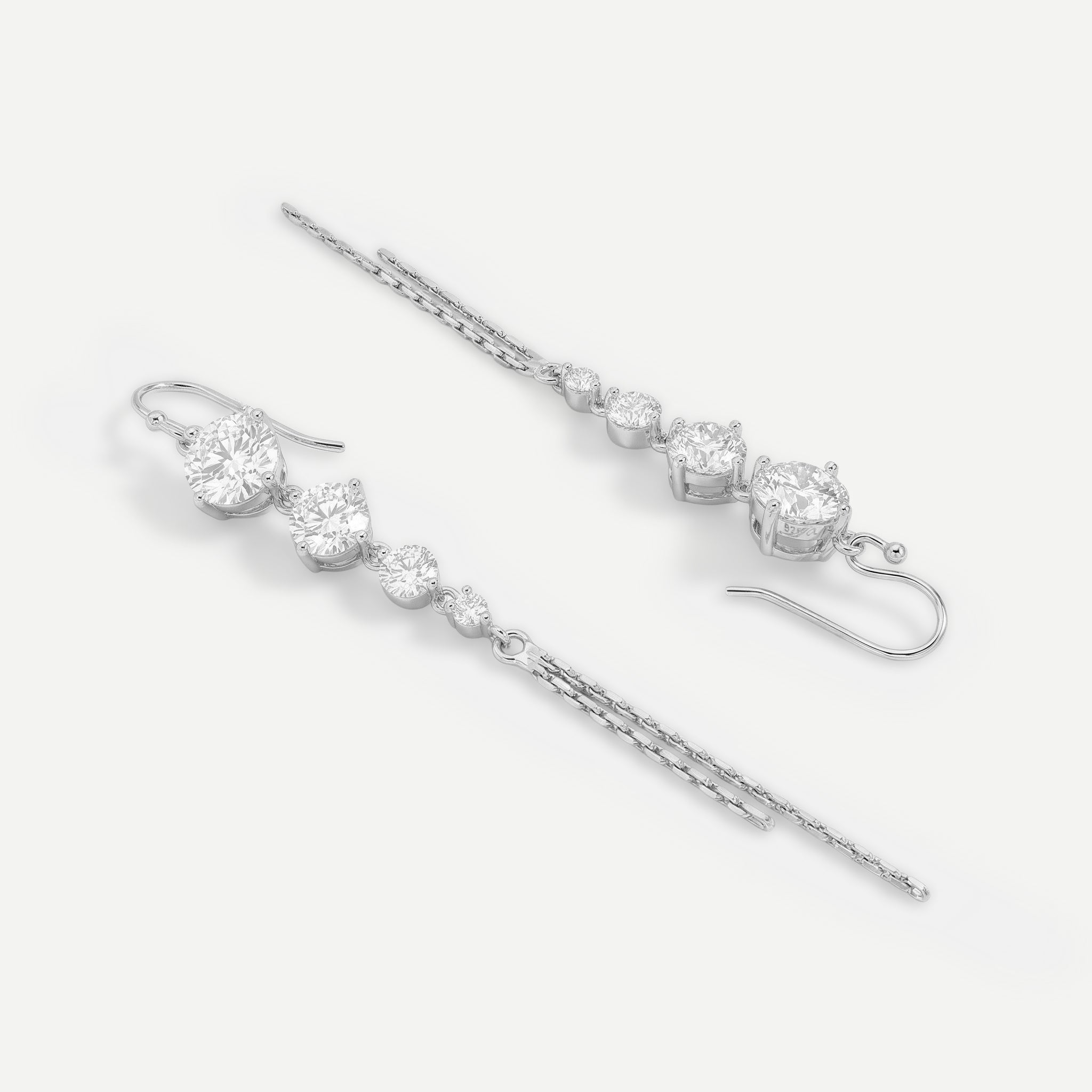 Diese tollen Ohrhänger aus 925 Sterling Silber sind schlicht und auffällig zugleich. Wie das geht? Mit ihrer filigranen Ausarbeitung hängen sie deutlich sichtbar unaufdringlich am Ohr. Mit den jeweils vier verschieden großen Zirkonia (synth.)Steinen funkelt es zu genüge an den 7 cm langen Ohrringen, die sich mit einem einfachen Haken anbringen lassen. Tolles Accessoire, das alleine oder auch mit anderen Schmuckstücken Aufsehen erregt!
